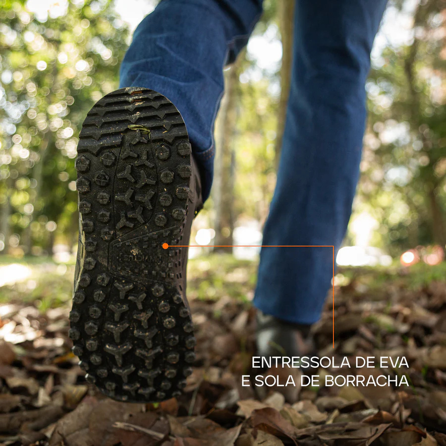 O solado com tecnologia COMFORTMAX combina borracha de alta resistência à abrasão com entressola em EVA, garantindo excelente tração, amortecimento suave e estabilidade superior em qualquer tipo de terreno.