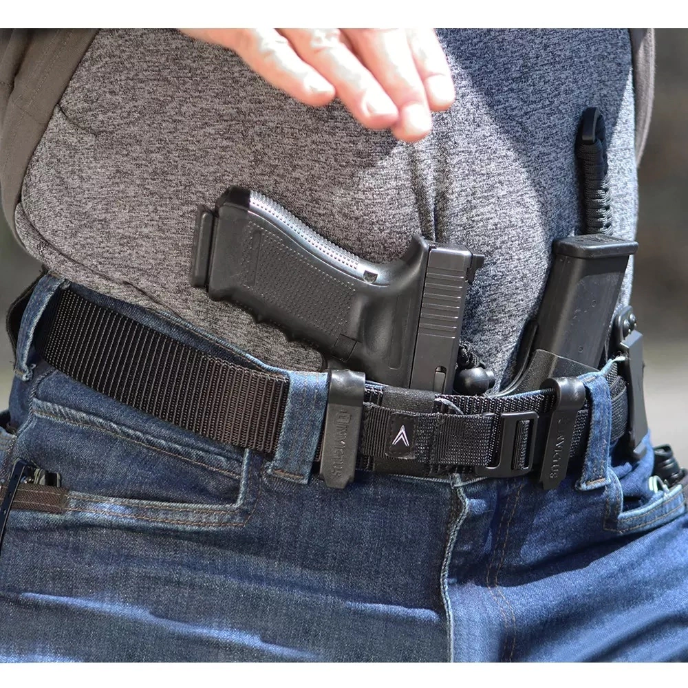 O design e o sistema de engate rápido da fivela proporcionam uma maior capacidade de ocultação do EDC carregado, não projetando a fivela na camiseta.