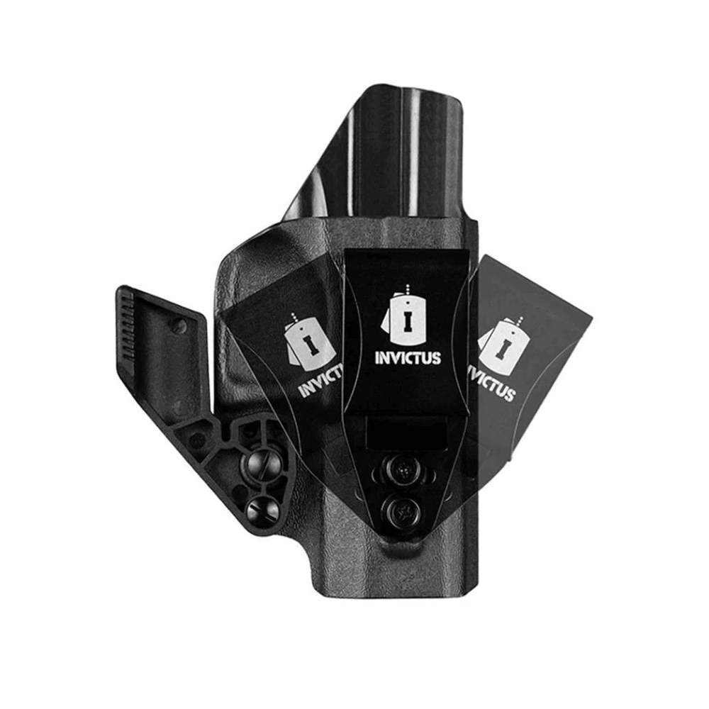 O modelo ainda conta com uma aba dissimuladora de volume, que pode ser retirada se necessário e retida do guarda mata ajustável. Um kit extra de parafusos é fornecido para caso desejar utilizar o coldre sem a aba dissimuladora de volume.