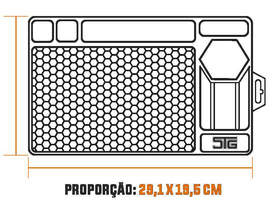 Possui base central mais ampla e divisórias laterais menores, para organização de peças e ferramentas, facilitando o manuseio por parte do operador.
