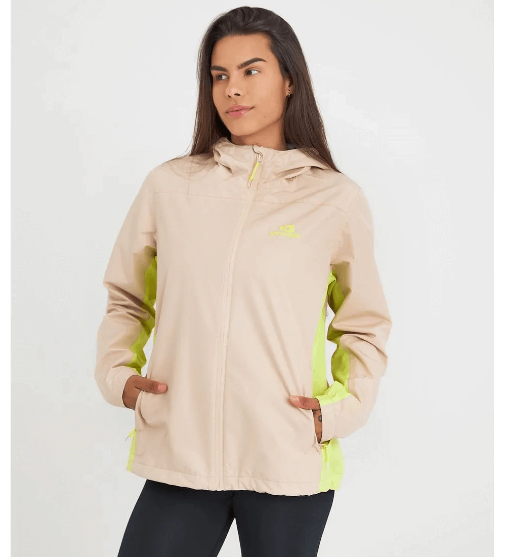 Jaqueta Corta Vento Impermeável Feminina desenvolvida com tecido construído em duas camadas fundidas: Rip Stop seguido por uma membrana de PU. Com zíperes e costuras seladas, possui impermeabilidade para suportar até 8.000 mm de coluna d’água.