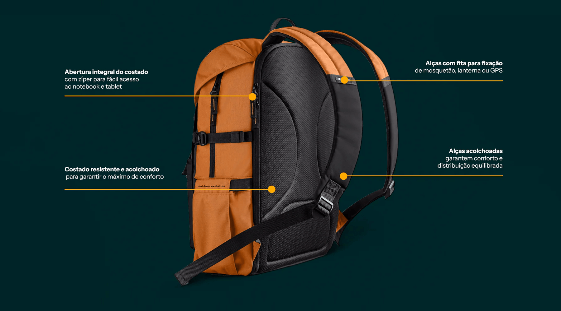 Com 30L de capacidade, compartimento dedicado para notebook de até 15” e acesso rápido pelo costado, ela resolve o caos da rotina — seja no trabalho, em viagens ou nas aventuras do dia a dia.