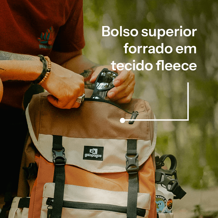 Bolso superior forrado em tecido fleece para acondicionar óculos e celular.