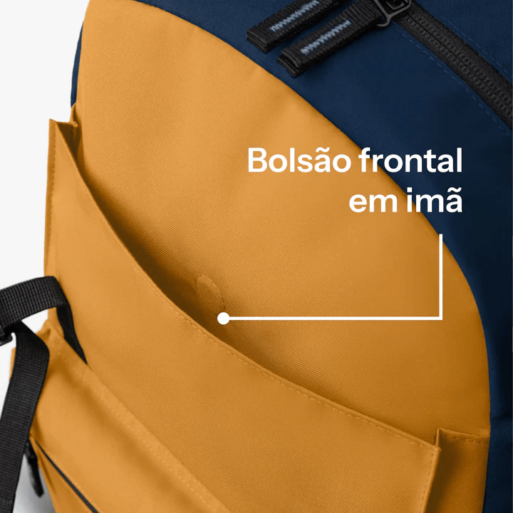 Feita em poliéster resistente e durável, possui bolsos laterais com elástico para garrafa, dois bolsos frontais (um com zíper e outro com fechamento em ímã) e compartimento interno com divisórias para melhor organização dos seus itens. As alças acolchoadas e o costado resistente garantem máximo conforto na correria do dia a dia.