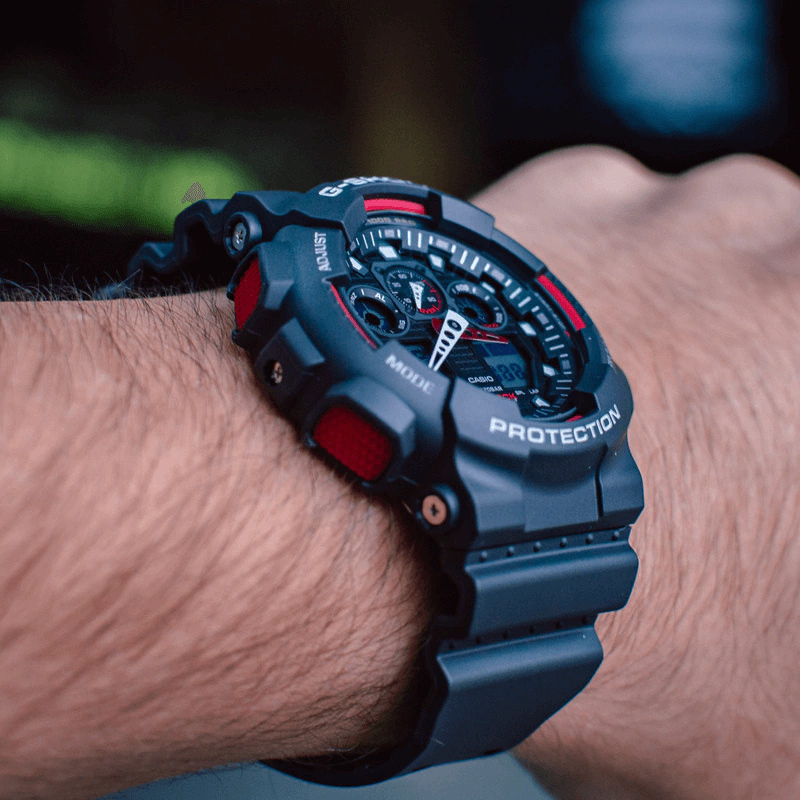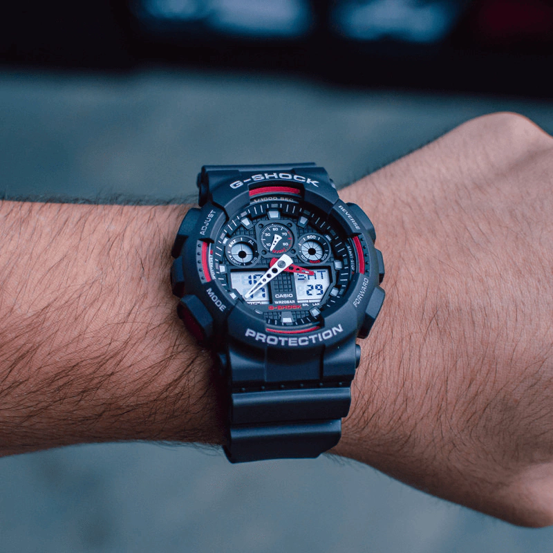 O popular design de três mostradores G-SHOCK incorpora um mostrador analógico no centro, com mostradores digitais em cada um dos lados.