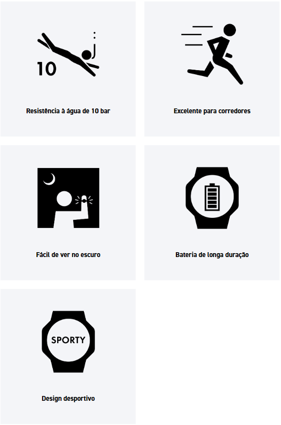 Cronómetro de 1/100 de segundo Capacidade de medição: 00'00''00~59'59''99 (durante os primeiros 60 minutos) 1:00'00~99:59'59 (após 60 minutos) Unidade de medição: 1/100 de segundo (durante os primeiros 60 minutos) 1 segundo (após 60 minutos) Modos de medição: Tempo decorrido, tempos de volta/parciais Capacidade de memória: Até 60 registos (número de dados, mês de início da medição, data, dia, tempos por volta/parciais, número de volta/parcial);